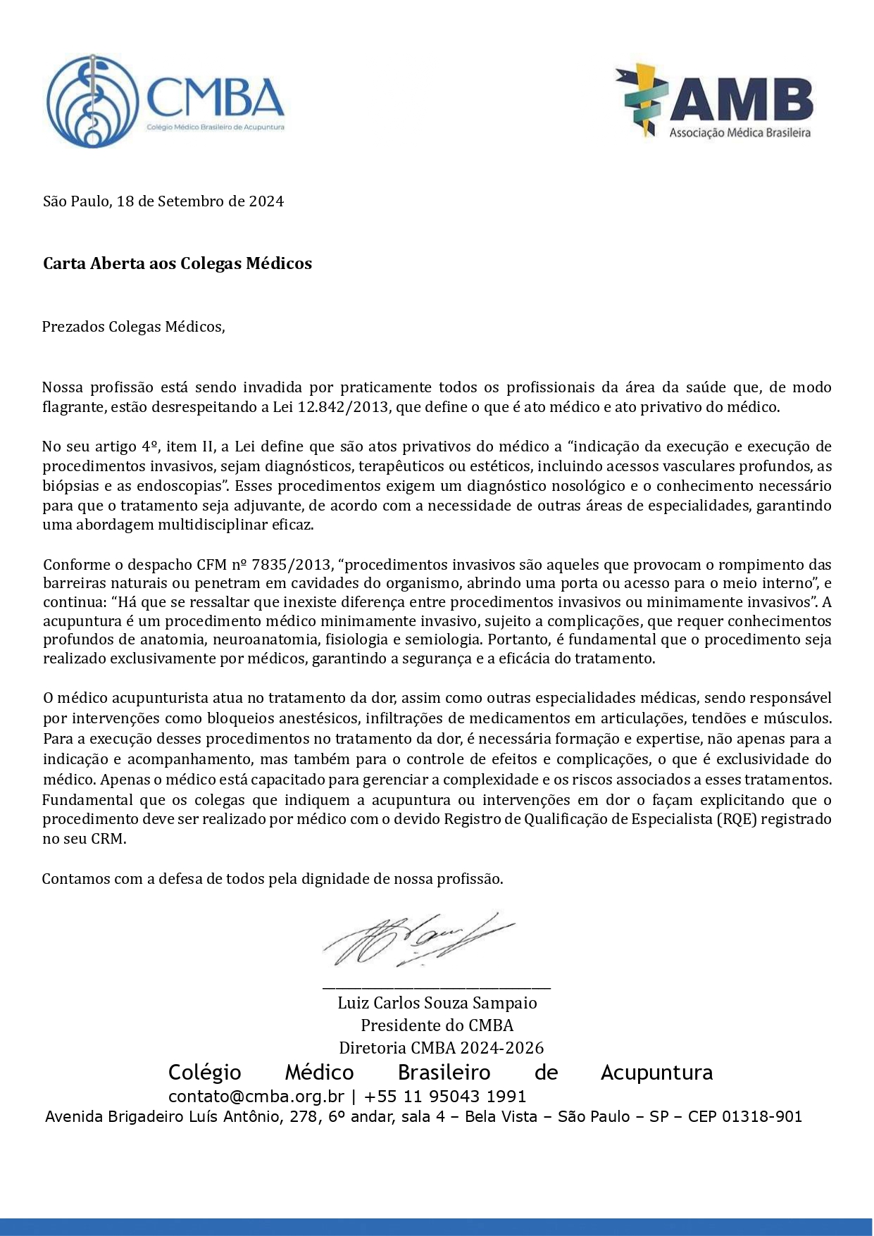 O Colégio Médico Brasileiro de Acupuntura (CMBA), publicou uma Carta Aberta aos Médicos, abordando questões de extrema relevância para a classe e para a proteção das prerrogativas dos atos médicos, conforme previsto na Lei 12.842/2013. O objetivo é alertar sobre os recentes desafios enfrentados por médicos e médicas de desse país.