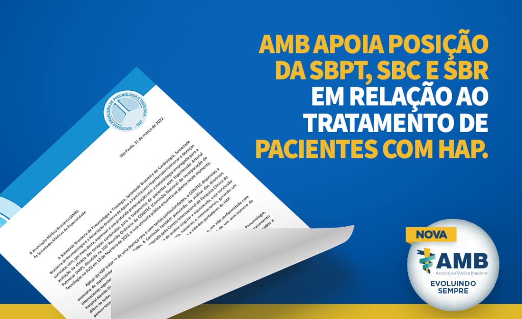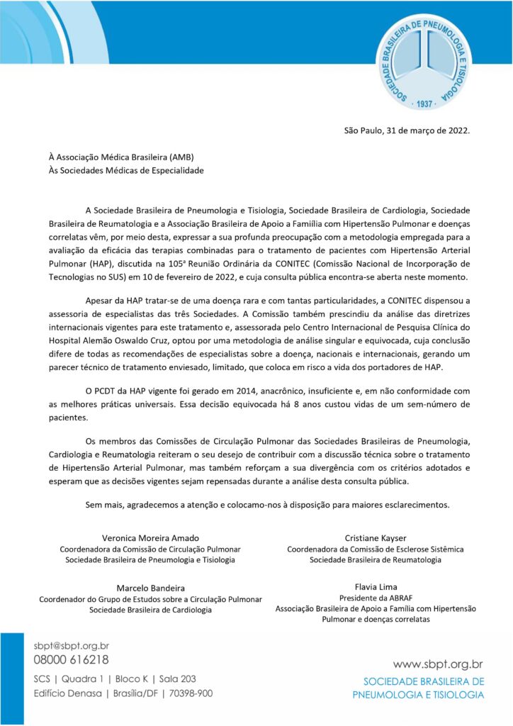 A Associação Médica Brasileira apoia a carta da Sociedade Brasileira de Pneumologia e Tisiologia, Sociedade Brasileira de Cardiologia e Sociedade Brasileira de Reumatologia, além da Associação Brasileira de Apoio a Família com Hipertensão Pulmonar e doenças correlatas expressando profunda preocupação com a metodologia empregada para a avaliação da eficácia das terapias combinadas para o tratamento de pacientes com Hipertensão Arterial Pulmonar (HAP), discutida na 105a Reunião Ordinária da CONITEC (Comissão Nacional de Incorporação de Tecnologias no SUS) em 10 de fevereiro de 2022. A Associação Médica Brasileira e as Sociedades de Especialidade signatárias convidam para que, num esforço conjunto, todos possam responder à consulta pública, até dia 04/04/2022, repudiando a proposta descomprometida e tecnicamente fraca feita pela CONITEC.