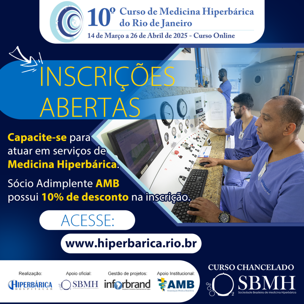 De 14 de março a 26 de abril de 2025 realizaremos a 10ª edição do Curso de Medicina Hiperbárica do Rio de Janeiro em edição 100% Online, sempre às sextas-feiras e sábados, dividido em cinco módulos, sendo às sextas-feiras de 18h às 22h e sábados de 09h às 13h.