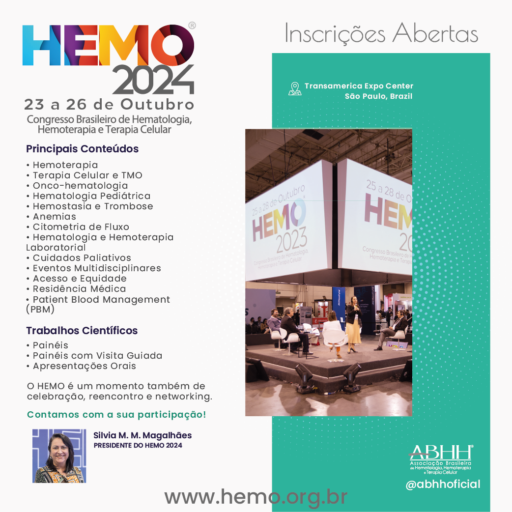 Consagrado por congressistas pela excelência apresentada nos últimos anos, o Congresso Brasileiro de Hematologia, Hemoterapia e Terapia Celular (HEMO), organizado pela Associação Brasileira de Hematologia, Hemoterapia e Terapia Celular (ABHH), acontecerá presencialmente entre os dias 23 a 26 de outubro, entre quarta-feira e sábado. Novamente, o congresso acontecerá no Transamerica Expo Center, em São Paulo.
