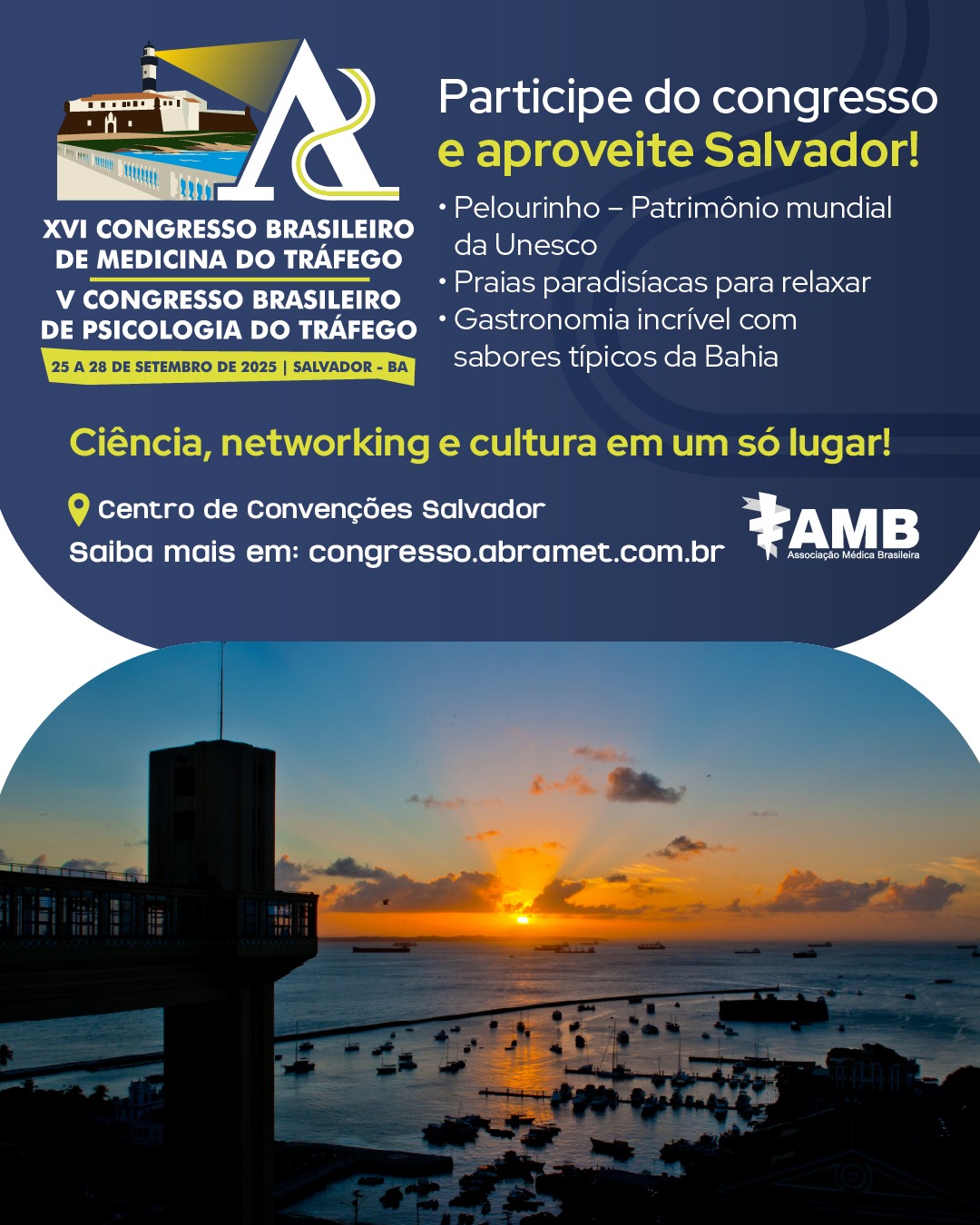 O XVI Congresso Brasileiro de Medicina do Tráfego e V Congresso Brasileiro de Psicologia do Tráfego será realizado no Centro de Convenções Salvador, em Salvador, de 25 a 28 de setembro. O congresso reunirá os principais especialistas nacionais e internacionais em saúde e segurança no trânsito, incluindo médicos e psicólogos do tráfego, líderes do setor, autoridades públicas, pesquisadores e acadêmicos.