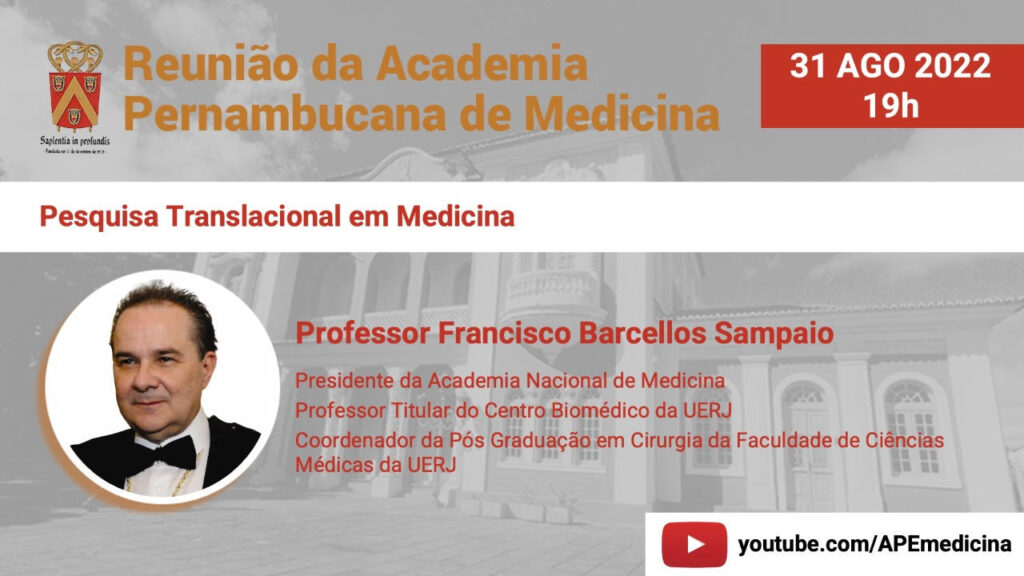 Anote em sua agenda: dia 31 de agosto de 2022, às 19h, acontecerá mais uma Reunião da Academia Pernambucana de Medicina, com o tema “Pesquisa Translacional em Medicina”.