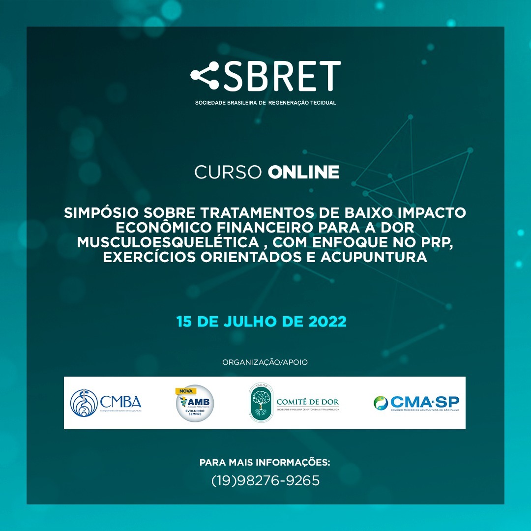 A SBRET (Sociedade Brasileira de Regeneração Tecidual), em parceria com o ABDOR (Comitê de dor da Sociedade Brasileira de Ortopedia e Traumatologia), CMAeSP (Colégio Médico de Acupuntura de São Paulo) e CMBA (Colégio Médico Brasileiro de Acupuntura), está organizando a primeira edição do Simpósio sobre tratamentos de baixo impacto econômico financeiro para dor musculoesquelética, com enfoque no PRP (Plasma Rico em Plaquetas), exercícios orientados e acupuntura.