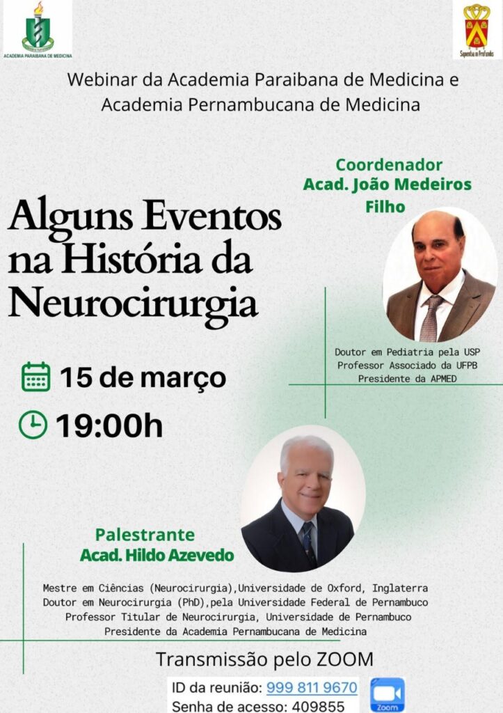 Com o tema “Alguns Eventos na História da Neurocirurgia” a transmissão terá a coordenação do Acad. João Medeiros Filho, presidente da Academia Paraibana de Medicina e como palestrante o Acad. Hildo Azevedo, presidente da Academia Pernambucana de Medicina.