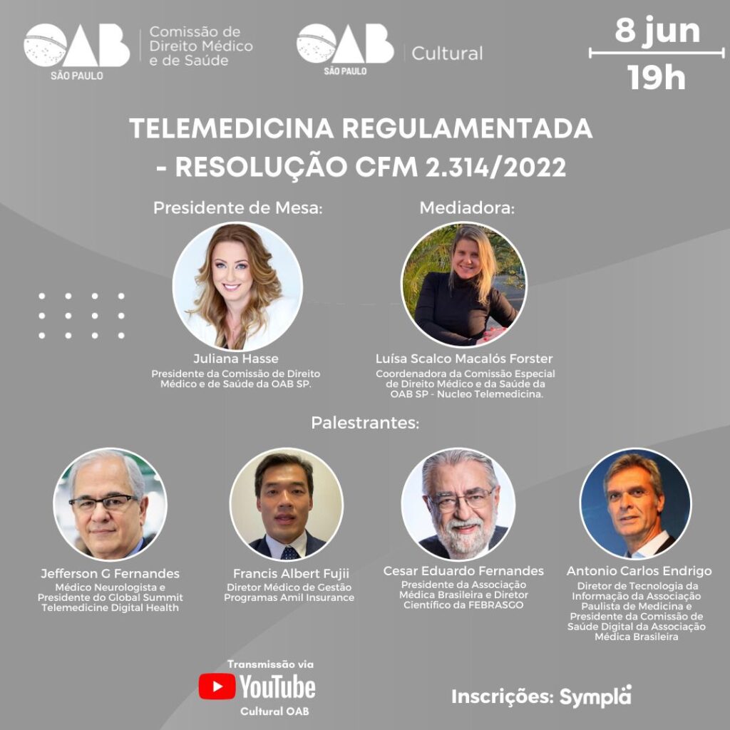 O Webinar Telemedicina Regulamentada – Resolução CFM 2.314/2022 terá o comando da Dra. Juliana Hasse, Presidente da Comissão de Direito Médico e de Saúde da OAB SP. O evento debaterá a resolução do Conselho Federal de Medicina, de 20 de abril de 2022, que define e regulamenta a telemedicina, como forma de serviços médicos mediados por tecnologias de comunicação. Entre os palestrantes estão o Dr. Cesar Eduardo Fernandes, Presidente da Associação Médica Brasileira e Diretor Científico da FEBRASGO, e o Dr. Antonio Carlos Endrigo, Diretor de Tecnologia da Informação da Associação Paulista de Medicina e Presidente da Comissão de Saúde Digital da Associação Médica Brasileira. A transmissão será feita pelo canal Youtube Cultural OAB.