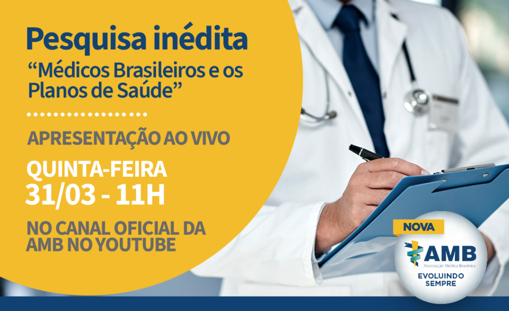 A Associação Médica Brasileira (AMB) e a Associação Paulista de Medicina (APM) divulgam a pesquisa “Os médicos brasileiros e os planos de saúde”, em 31 de março de 2022, às 11h, em coletiva de imprensa on-line.