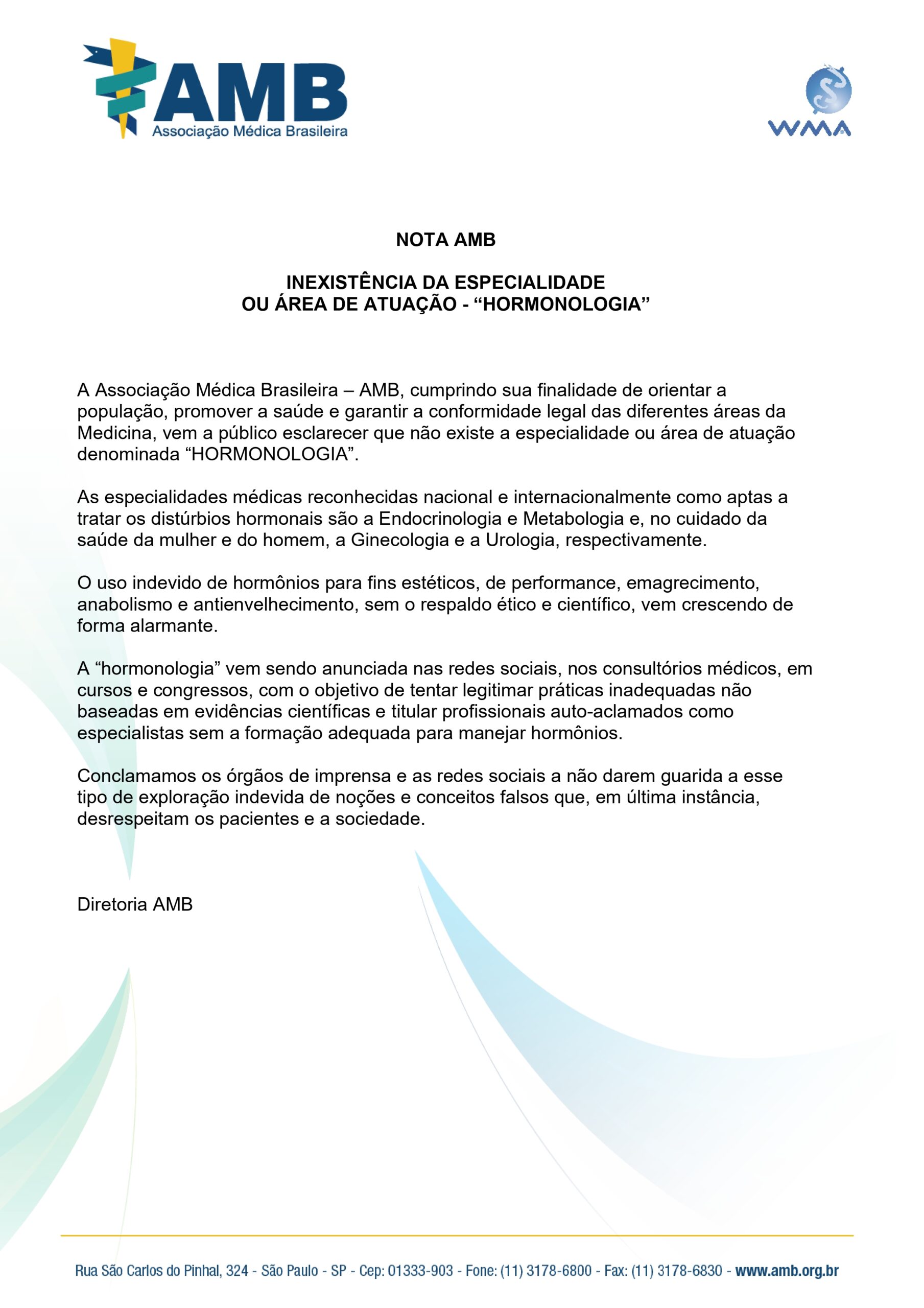 NOTA AMB: “HORMONOLOGIA” - INEXISTÊNCIA DA ESPECIALIDADE OU ÁREA DE ATUAÇÃO