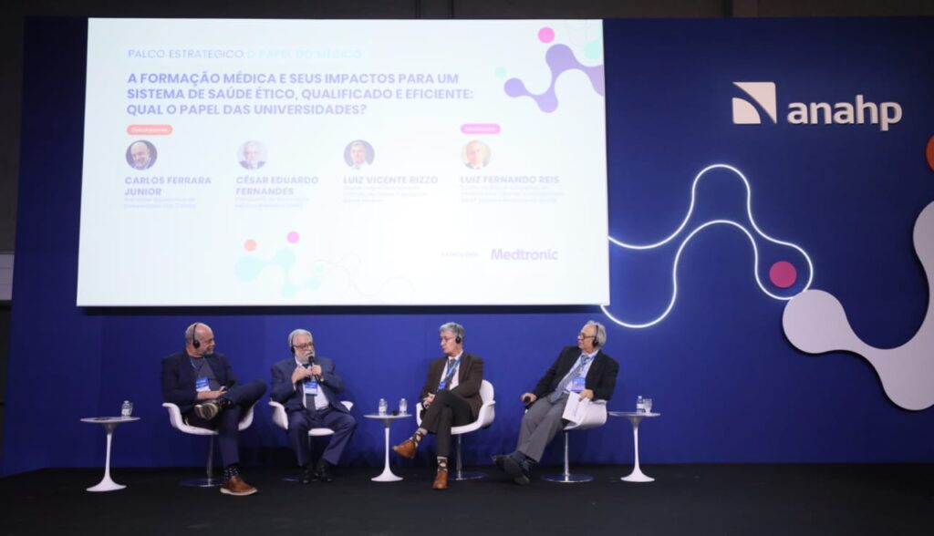 O presidente da Associação Médica Brasileira, César Eduardo Fernandes, foi um dos debatedores convidados, participando do painel sobre “A formação médica e seus impactos para um sistema de saúde ético, qualificado e eficiente: Qual o papel das universidades?” que aconteceu no palco com a temática “O papel do médico”.